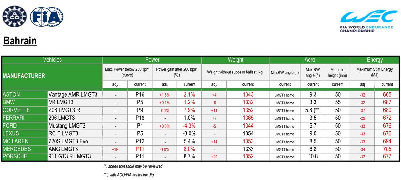 Passando alla categoria LMGT3, il BoP per la 8 Ore del Bahrain segna un incremento generale per quanto riguarda i pesi. Solo Mercedes e Lexus mantengono invariati i propri valori rispetto al Fuji: le AMG GT3 restano a 1333 kg, mentre le RC F GT3 rimangono a 1354 kg. Le Ferrari 296 GT3 diventano le vetture più pesanti della categoria, toccando i 1365 kg, seguite dalle McLaren 720S GT3 e dalle Corvette Z06 GT3, rispettivamente a 1353 e 1352 kg.