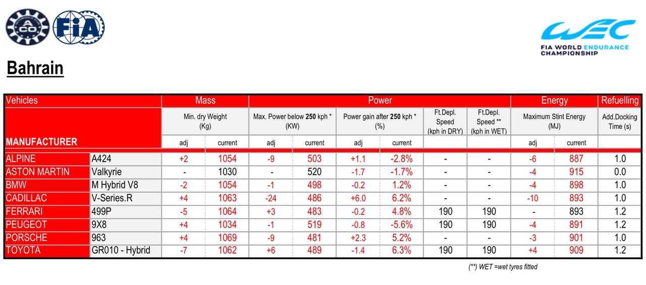 Non sorride invece la Cadillac, che in Bahrain sarà costretta a convivere con un doppio handicap. Le Hypercar americane si ritroveranno a Sakhir con un peso incrementato di 4 kg (per un totale di 1063 kg) e una potenza sensibilmente ridotta di 486 kW (-24 kW). Solo oltre i 250 km/h le V-Series.R LMDh potranno sfruttare un incremento del 6%, ma a fronte di soli 893 MJ per stint di energia disponibile.