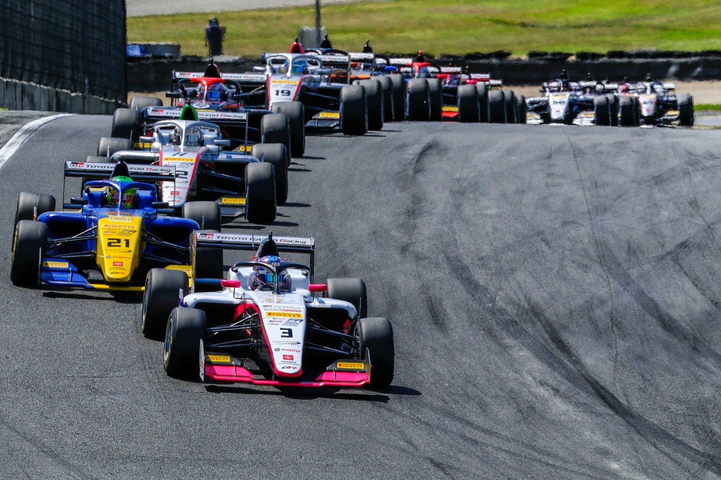 Kalle Rovanpera. Non è stato un facile avvio per lui. Con la Tatuus del team Hitech si è qualificato 16esimo e in gara, dopo aver superato varie battaglie nelle retrovie e anche una scorribanda sull'erba ben controllata (e ci mancherebbe) ha visto il traguardo in 17esima posizione.
