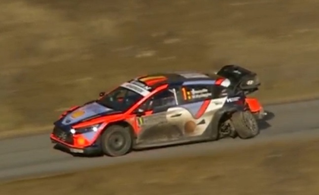 Ed è proprio nella PS6 che si è consumata una vera e propria disfatta per Neuville. Costretto ad aprire le speciali odierne, il campione in carica del WRC, nell’affrontare un tornante a destra, è arrivato troppo veloce sbattendo contro un terrapieno. Nell’impatto si è rotta la sospensione posteriore sinistra della sua Hyundai (nella foto sopra). Ciò nonostante Neuville è riuscito a riprendere la marcia e, pur con la ruota penzoloni, ha tagliato il traguardo perdendo quasi due minuti. Precipitato al nono posto, l’equipaggio belga si affiderà ora ai meccanici Hyundai che dovranno riparare velocemente la vettura.