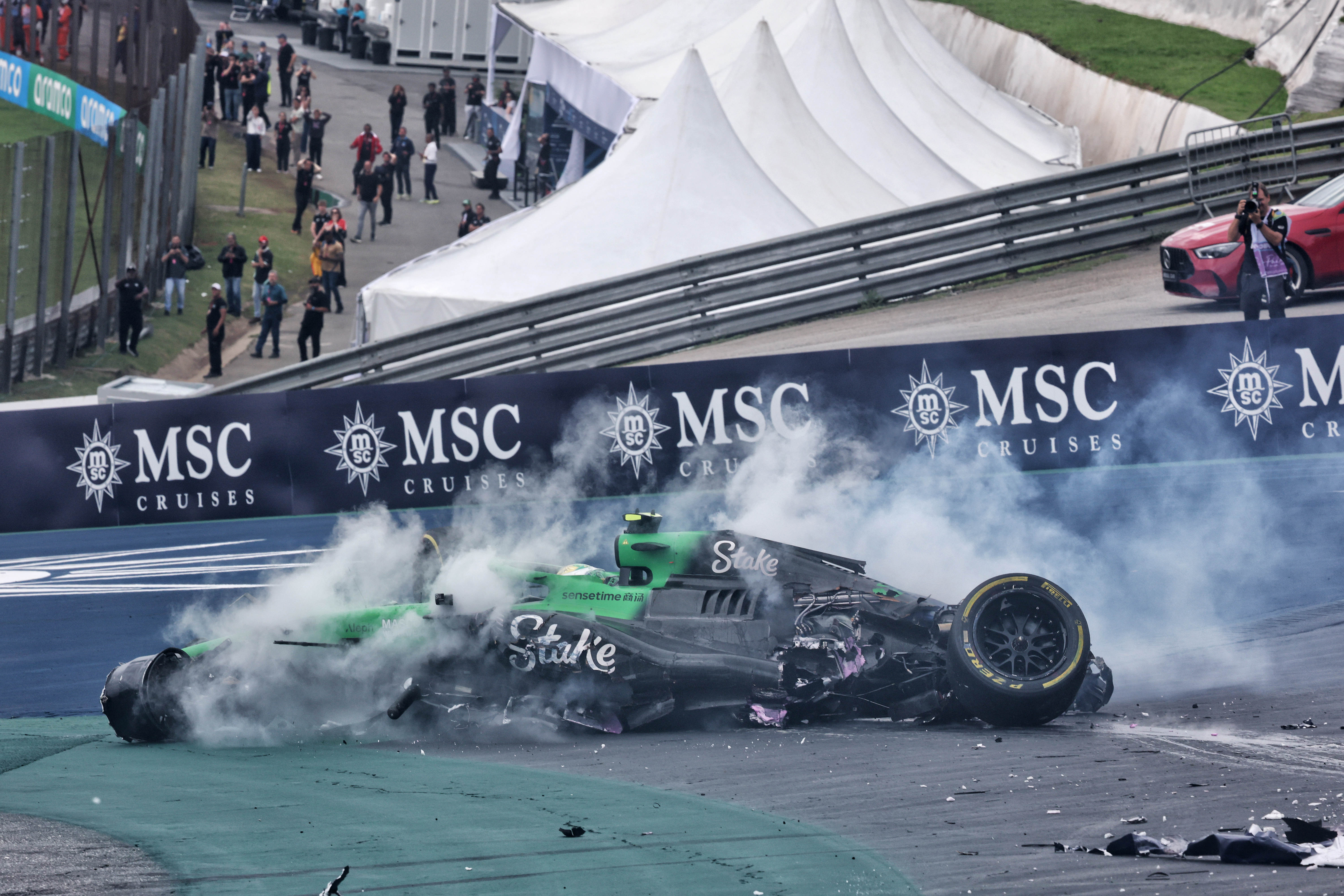 incidente a Bortoleto. Alle spalle di Hadjar, ha tentato il sorpasso alla prima curva, ma uscendo dalla scia della Racing Bulls, è finito su un tratto di asfalto bagnato mentre iniziava la frenata. La sua Sauber è partita via come un proiettile impazzito colpendo con violenza il muretto box, attraversando la pista, sfiorando la Williams di Alexander Albon che li precedeva (bravo nel vedere dallo specchietto quel che stava accadendo e frenando) per poi finire brutalmente contro le barriere. Sauber distrutta, per fortuna Bortoleto non si è fatto nulla.