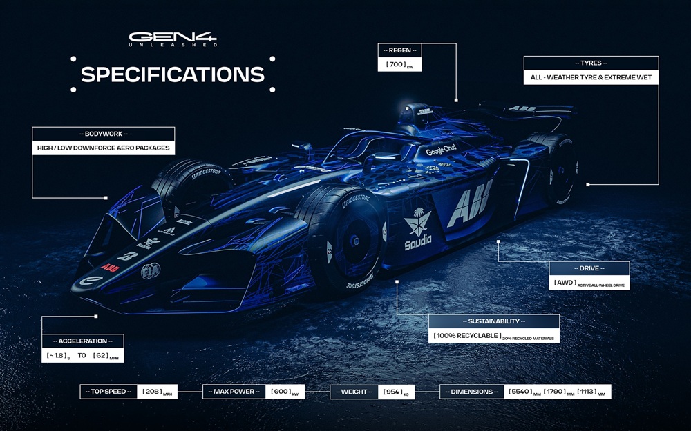 Protagonista di questa rivoluzione è la nuovissima Gen 4 presentata ufficialmente sul tracciato del Paul Ricard. Con una potenza che in qualifica raggiunge i 600 kW, equivalenti a 800 cavalli, e circa 450 kW disponibili in gara, le nuove monoposto segnano un incremento enorme rispetto alla generazione precedente. Inoltre la combinazione tra trazione integrale, carico aerodinamico più che raddoppiato e nuove gomme sviluppate da Bridgestone porta la Formula E in una dimensione tecnica decisamente più elevata.
